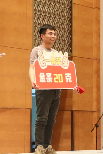 隨著三等獎的抽出,晚會氣氛達到一個小高潮。幸運兒們滿心歡喜地領(lǐng)取了獎品5克金條。
